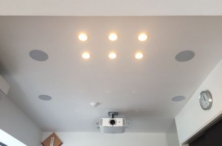 天井に取り付けるスピーカーはサラウンドスピーカー・トップスピーカー共に“LINN CLASSIK UNIK”を天井吊り設置しております。