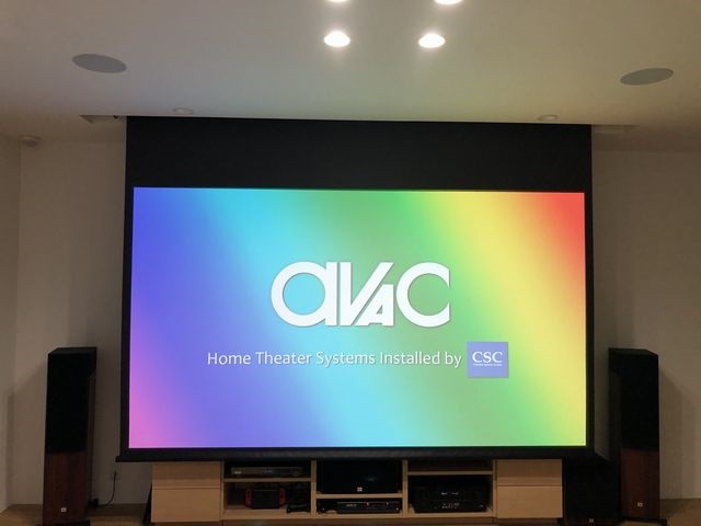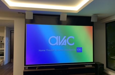 スクリーンサイズは、可能な限り大きいサイズにするため、フロントスピーカーをプロジェクターの光軸にかぶらないところまで前に出すことにより110インチの画面サイズを実現することに成功いたしました。