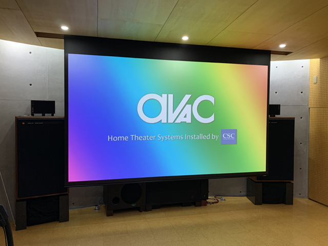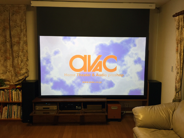 120インチの大型スクリーンは、インストーラー栗原氏の提案で壁から支持架を出す形で設置されています。