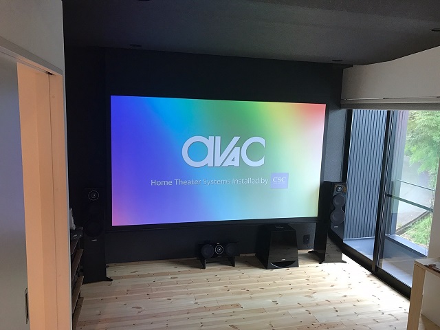 プロジェクターの迷光対策等を考えて、正面の壁紙は黒色をチョイス。