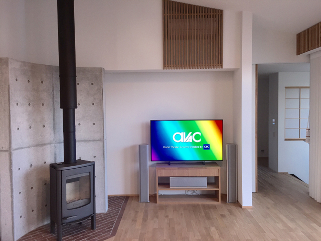 「木のぬくもりが感じられるリビングに120インチ大画面&最新立体音響(5.1.4ch)システムを導入」