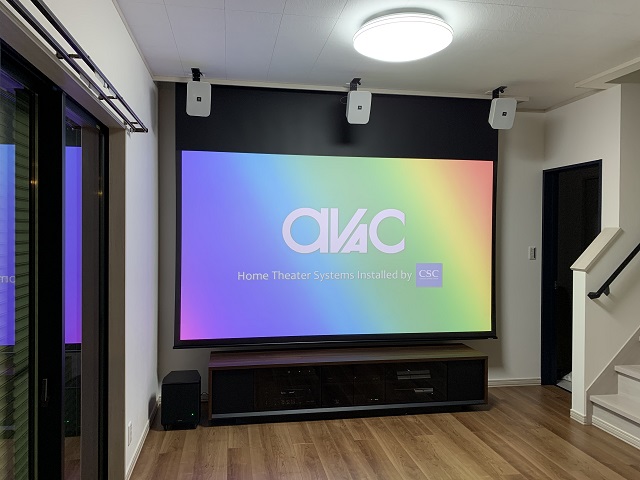 こちらはプロジェクター側の様子です。吹き抜けを生かし、サラウンドスピーカーをきれいに収めるように配慮いたしました。ホームシアターを導入するにあたって、ほとんどのお客様が気にされるのは「コスト」とその「コストに対してのパフォーマンス」だと思います。ホームシアター導入にかかる費用などでお悩みのお客様は、ぜひ一度アバックまでご相談ください。