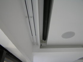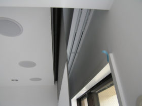 RC造のマンションで壁天井共に収納スペースを作る事が出来ましたので、スピーカー(6.1ch)、スクリーン共に埋込としました。 スクリーンの埋込後方に、カーテンBOXを一緒に造作しています。