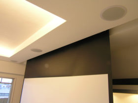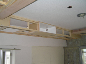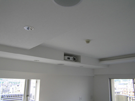 RC造のマンションで天井が直天井(RC面にクロス仕上げ)でしたので、埋込スピーカーを施工する為に前方後方共に梁型を造作しました。  前方の梁型にはフロントスピーカー3本埋込、梁型の奥にスクリーンを埋込んであります。  後方の梁型にはサラウンドスピーカー2本とサラウンドバックスピーカー1本、さらにプロジェクター(BOX)を埋込みました。  前方から後方への配線は、既存のサッシ上部にカーテンボックスが設置されており、ここに空間が有りましたので、この空間を利用して配管・配線しました。  また、前方の機材の後方壁は、CD管・スピーカーケーブルを配線する為に、「ふかし壁」となっています。