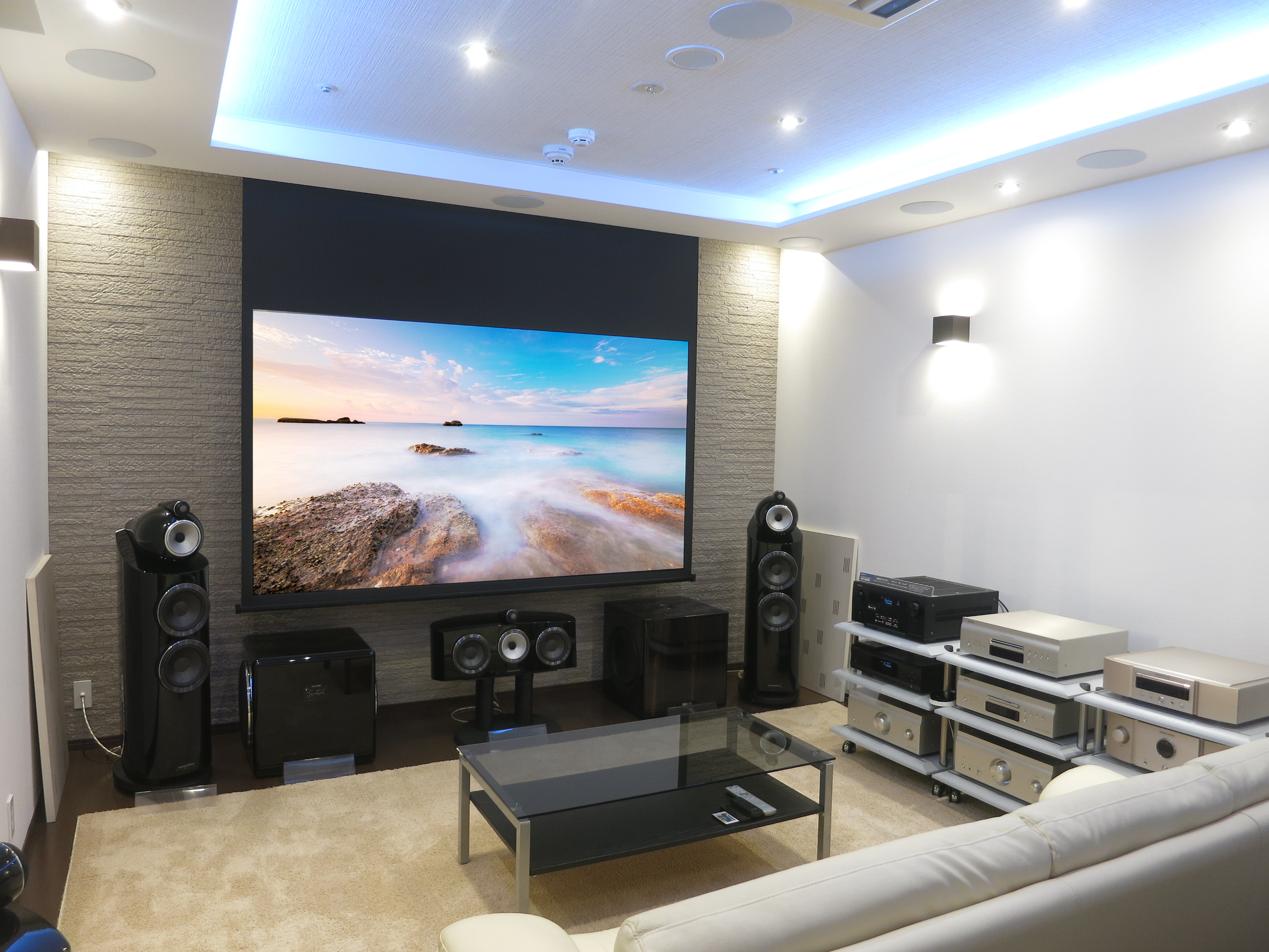 一般的には大型テレビやプロジェクターとスクリーンを用いた80inchを超える大画面と、AVアンプと5.1ch以上のスピーカーによるサラウンド再生が組み合わさったスタイルが主流です。