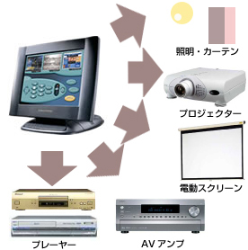 これらの操作をまとめて引き受けてくれるのがタッチ パネルです。事前に登録しておいた手順にそって、 カーテンを閉め、照明を落とし、スクリーンを下ろします。