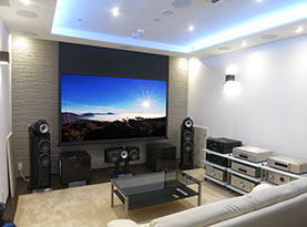 一般的には大型テレビやプロジェクターとスクリーンを用いた80inchを超える大画面と、AVアンプと5.1ch以上のスピーカーによるサラウンド再生が組み合わさったスタイルが主流です。
